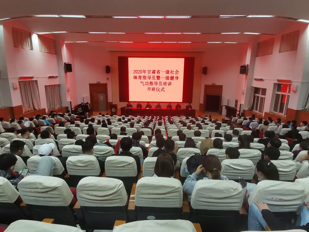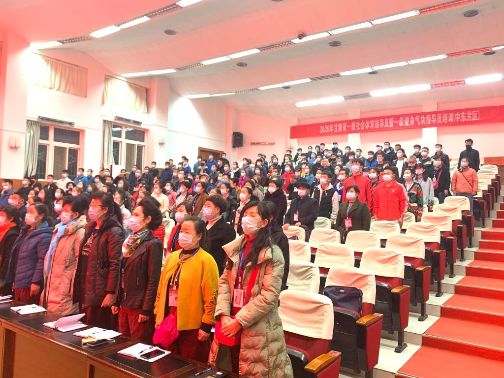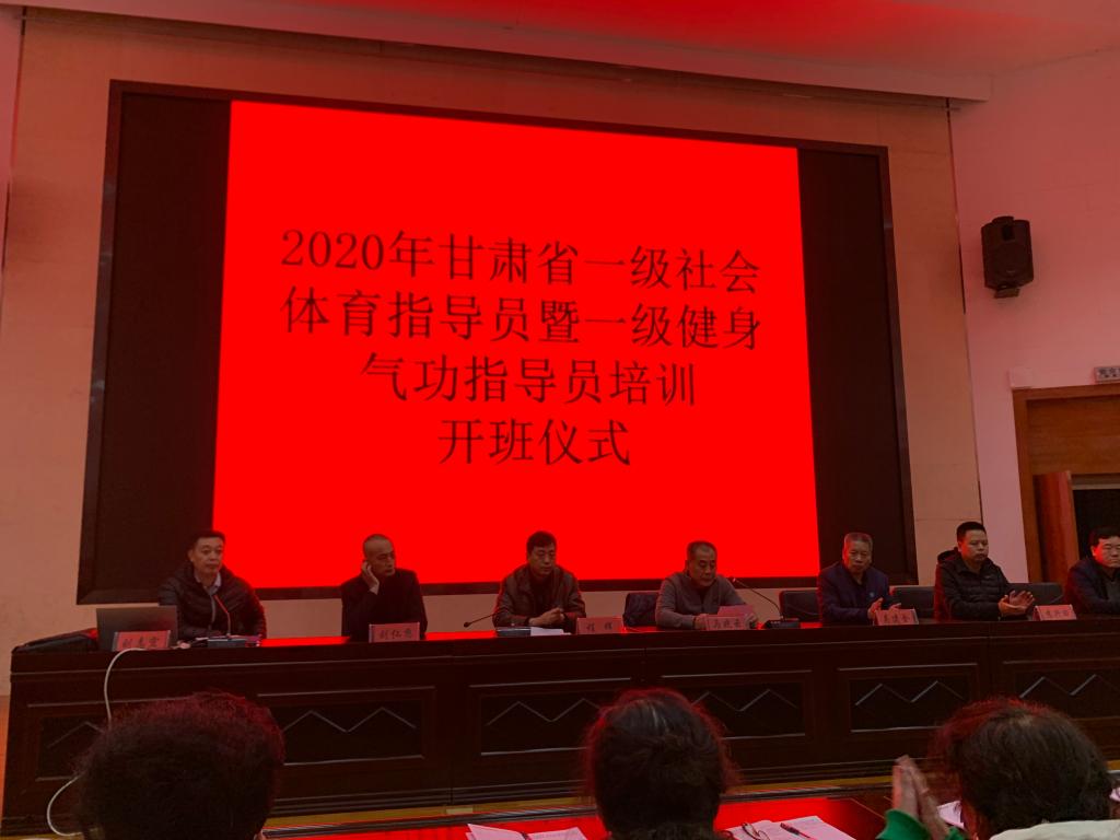 为了贯彻落实《全民健身计划(2016-2020年)》,加强我省社会体育指导员队伍,11月5日晚,2020年甘肃省一级社会体育指导员暨健身气功一级社会体育指导员培训班(中东片区)在二号报告厅隆重开班,甘肃省社会体育管理中心副主任马晓云,甘肃省社会体育指导员协会副会长、天水市麦积区体育发展中心主任李永明,体育公司党总支副书记吴建全,副经理程晖、刘仁憨、苏兴田出席开班典礼,本次开班典礼由甘肃省社体中心健身气功部部长刘志宏主持。