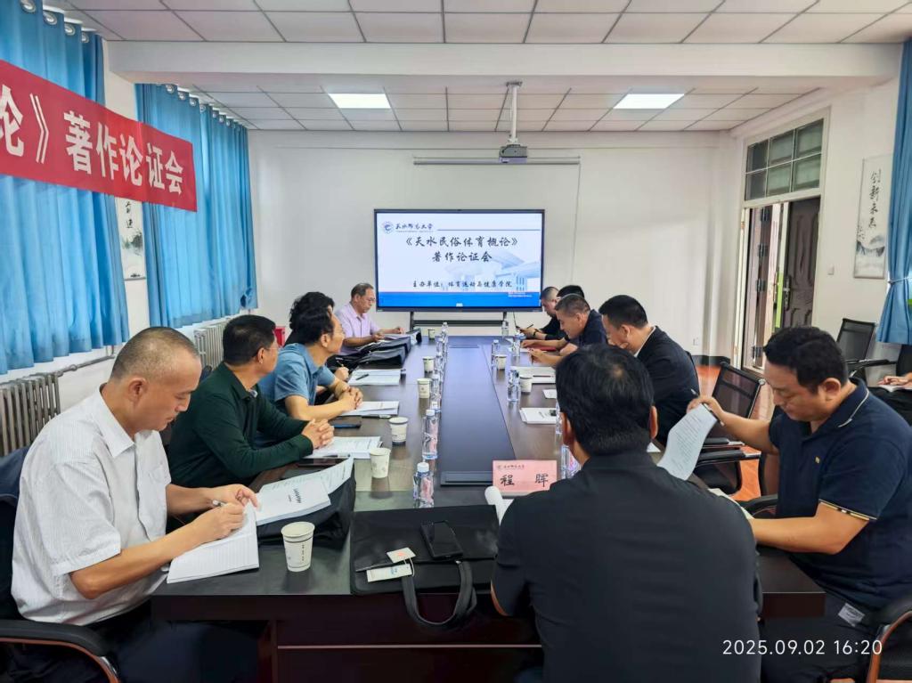 会议伊始,著作撰写团队负责人苏兴田教授就《天水民俗体育概论》的编写背景、内容框架及撰写进程进行了汇报。随后,与会专家围绕著作内容展开深入研讨,专家们一致认为该著作具有显著的开创性和系统性,填补了天水民俗体育研究领域的空白,结构科学、跨学科融合特色鲜明,对传承陇右文化、培养员工本土认同及推动民俗体育当代转化具有重要价值。同时建议进一步优化图文编排与概念界定,深化个案挖掘与地域文化融合,补充数字化、视频化资源,融入地方及校本课程开发,提升学术质量,并拓展推广与应用渠道。