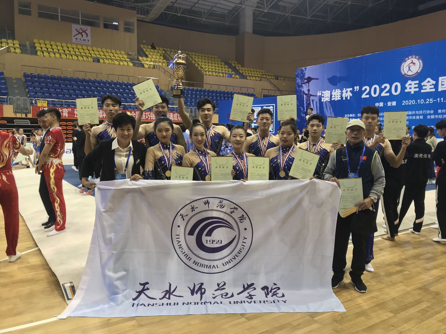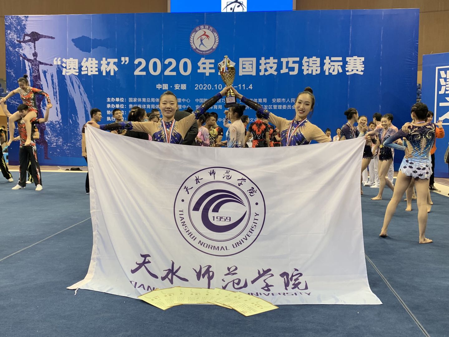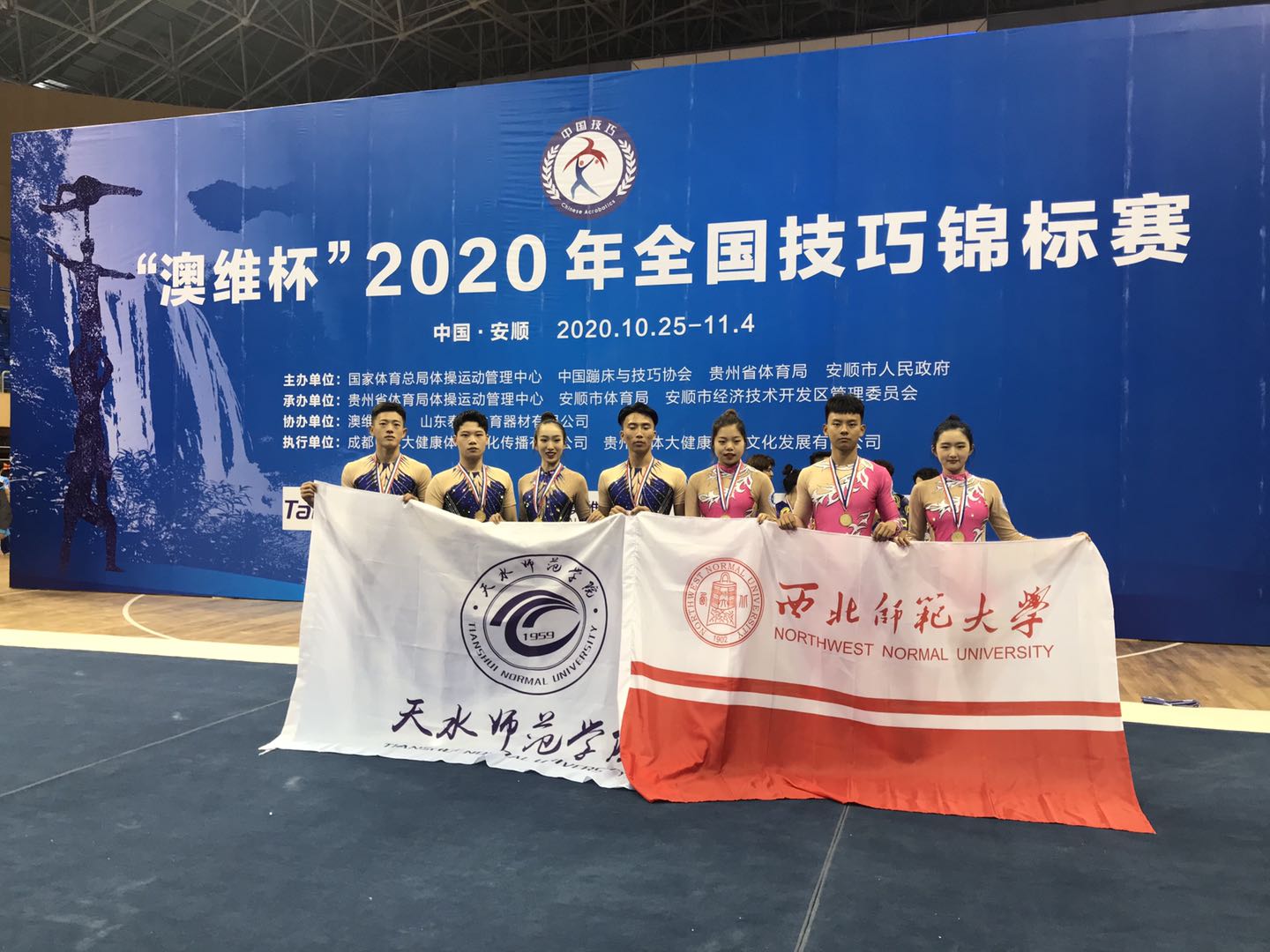 10月25日至11月4日,由国家体育总局体操运动管理中心、中国蹦床技巧协会、贵州省体育局、安顺市人民政府主办的2020“澳维杯”全国技巧锦标赛在贵州省安顺市隆重举行,共有来自全国10余个省市的71支代表队500余名运动员参赛。此次比赛中,公司与西北师范大学组成联队,参加3个项目的竞赛。